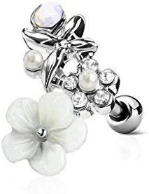 Surgical Steel CZ and Clay Flowers Curve Top Ear Cartilage Barbell Studs