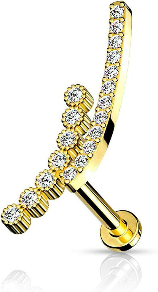 Surgical Steel Internally Threaded Double Lined CZ Paved Curve Top on Flat Back Stud for Labret Monroe Cartilage