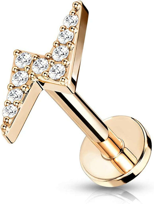 Surgical Steel Internally Threaded Lightning Bolt Paved with Round CZ Top Flat Back Stud for Labret Monroe Cartilage