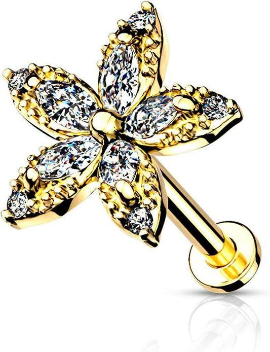 Surgical Steel Internally Threaded Marquise CZ Flower Top on Flat Back Stud for Labret Monroe Cartilage