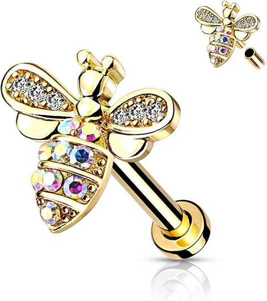 Surgical Steel Internally Threaded Micro CZ Paved Bee with AB Crystals on Flat Back Stud for Labret Monroe Cartilage