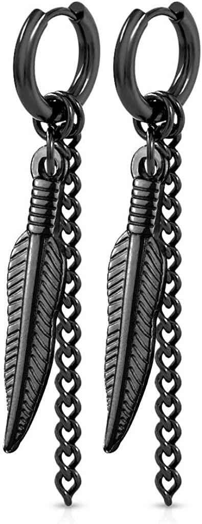 Surgical Steel Pair of Feather and Chain Dangle Round Clicker Hoop Earring