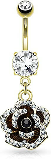 Surgical Steel Pave Crystal Petals on Black Flower Dangle Belly Navel Ring
