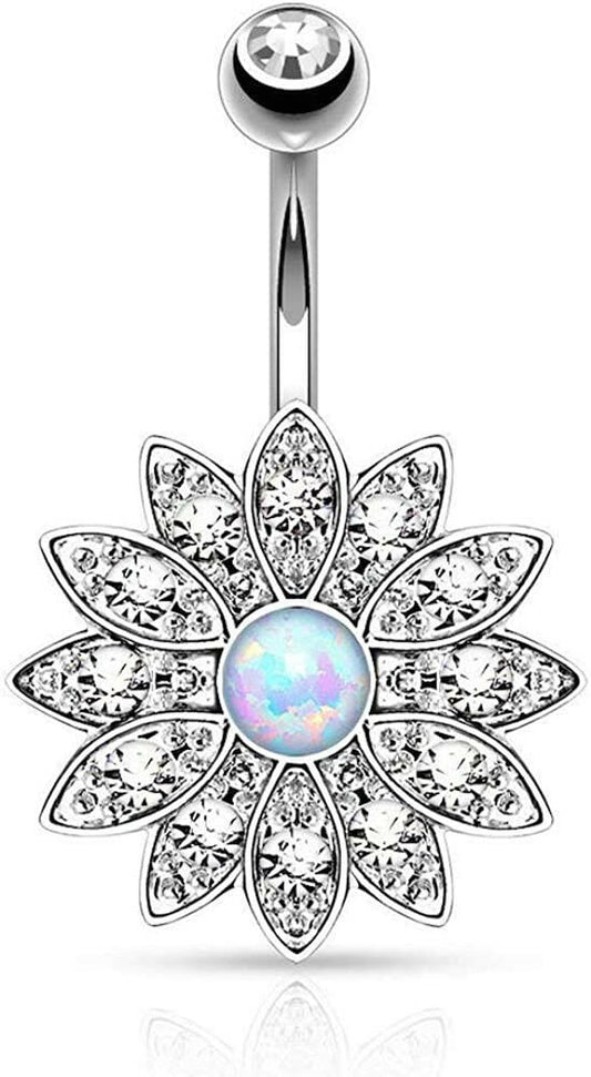 Surgical Steel Paved Crystal Flower with Opal Belly Navel Ring