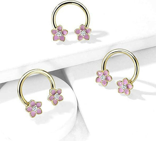 Surgical Steel Pink Enamel Flower With CZ Center Circular Horseshoe
