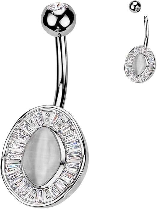 Surgical Steel Baguette CZ Edge With Cat's Eye Stone Center Belly Button Navel Ring