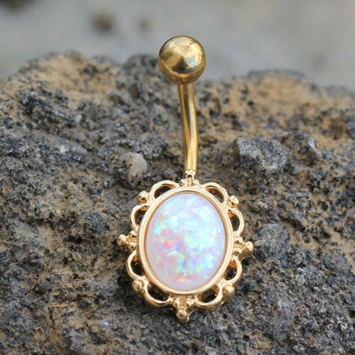 Gold Plated White Synthetic Opal Ornate Charm Navel Ring
