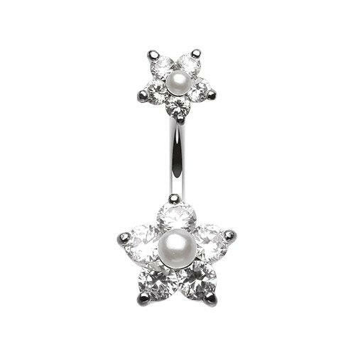 Cubic Zirconia Sparkle Pearl Bead Flower Belly Button Ring