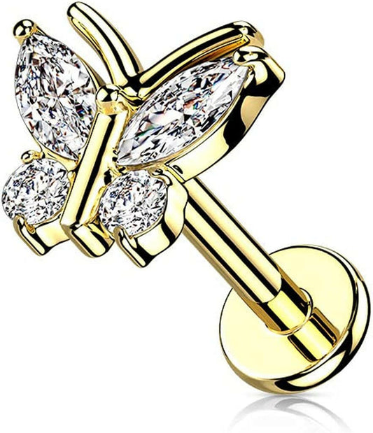 Surgical Steel Internally Threaded CZ Butterfly Top Flat Back Stud for Labret Monroe Cartilage