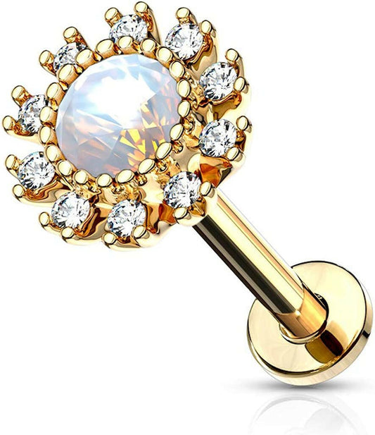 Surgical Steel Internally Threaded Cluster CZ Paved Round Flower with Opalite Center Flat Back Studs for Labret Monroe Ear Cartilage
