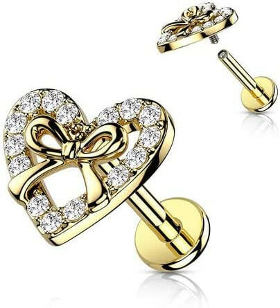 Surgical Steel CZ Paved Heart with Ribbon Center Top Flat Back Stud for Labret Monroe Cartilage
