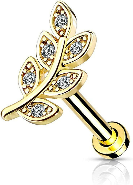 Surgical Steel Internally Threaded Micro CZ Paved Leaf Top on Flat Back Stud for Labret Monroe Cartilage