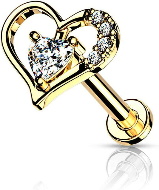 Surgical Steel Internally Threaded Paved Heart Contour with Heart CZ Solitaire on Flat Back Stud for Labret Monroe Cartilage