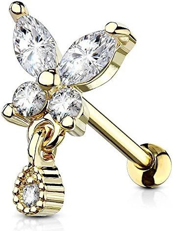 Surgical Steel CZ Butterfly with tear Drop Dangle Ear Cartilage Tragus Barbell Studs