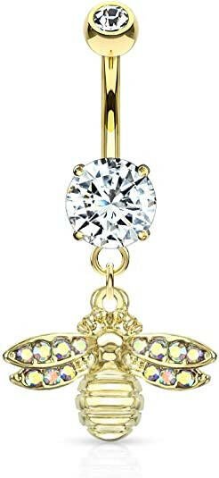 Surgical Steel Bee with AB Crystal Paved Wings Dangle Double Jeweled Belly Navel Ring