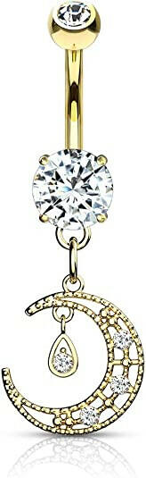 Surgical Steel CZ Paved Crescent Dangle Round CZ Belly Navel Ring