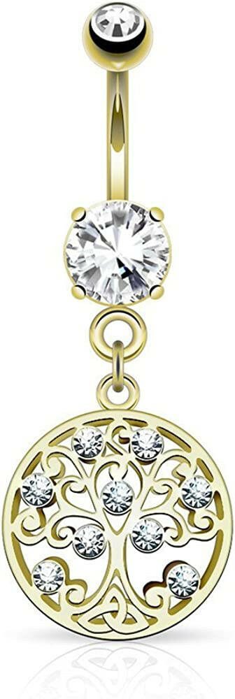 Surgical Steel CZ Tree of Life Dangle on Round CZ Belly Navel Ring
