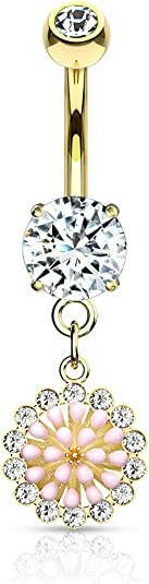 Surgical Steel Pink Enamel Cluster With CZ Around Dangle Round CZ Belly Navel Ring