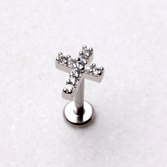 Stainless Steel Jeweled Cross Labret - Internally Threaded