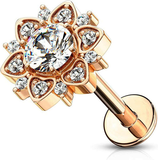 Surgical Steel Internally Threaded Paved CZ Flower with Round CZ Center Flat Back Studs for Labret Monroe Ear Cartilage