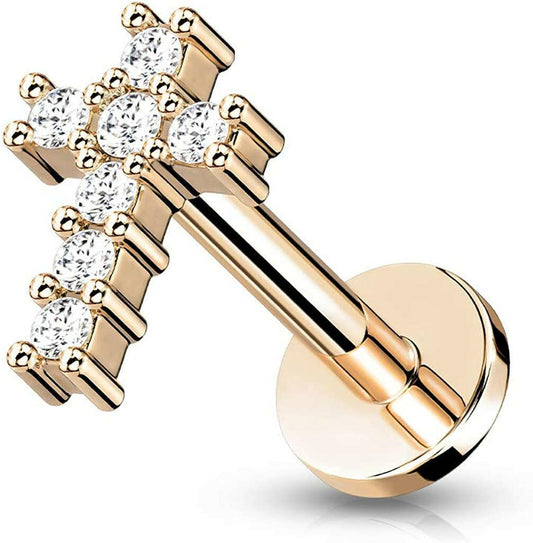 Surgical Steel Internally Threaded Round CZ Paved Cross Top Flat Back Stud for Labret Monroe Cartilage
