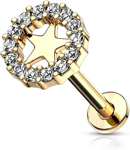 Surgical Steel Internally Threaded CZ Paved Circle with Star Flat Back Studs for Labret Monroe Ear Cartilage