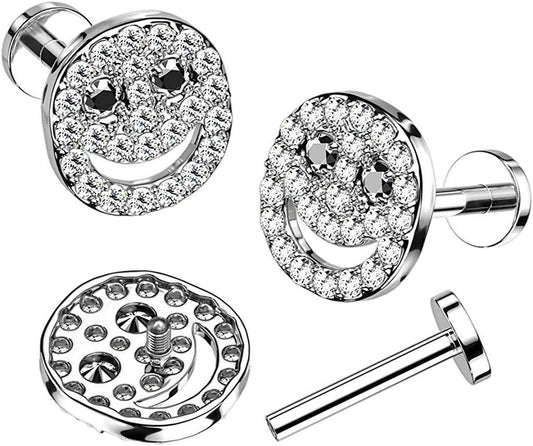 Surgical Steel Internally Threaded CZ Paved Smiley Face with Black CZ Eyes on Flat Back Stud for Labret Monroe Cartilage