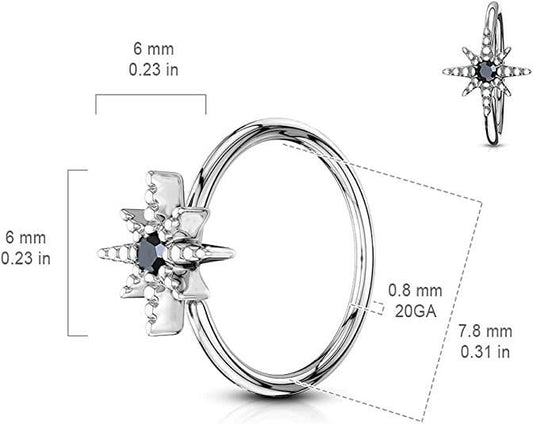 Brass Black CZ Centered Starburst Cartilage Bendable Hoop Nose Rings