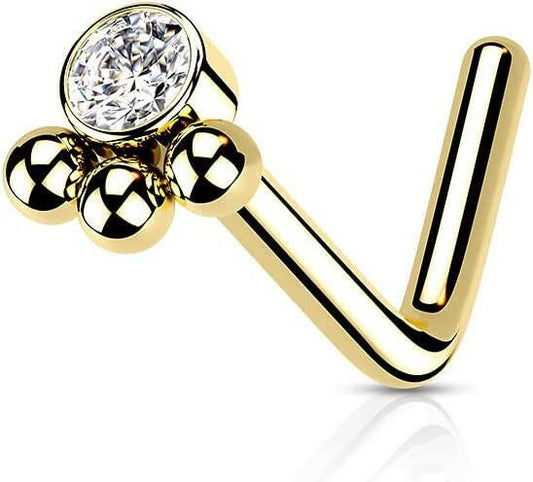 Surgical Steel 3 Beaded Ball Cluster with CZ Center L Shaped Nose Ring
