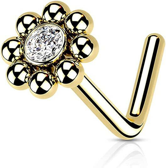 Surgical Steel Beaded Ball Edge with CZ Center Top L Shaped Nose Ring