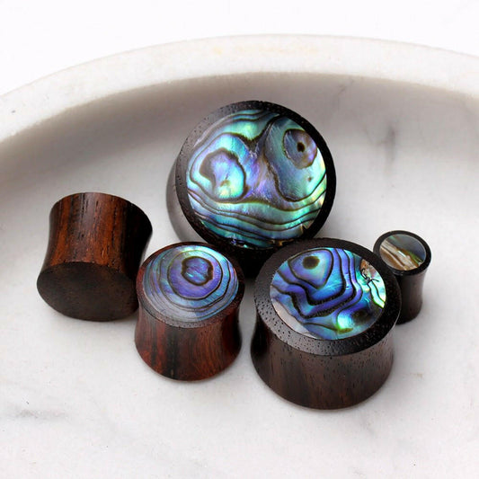 Natural Organic Sono Wood Saddle Plug Earrings with Abalone Inlay