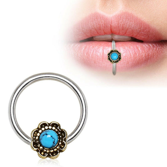 Stainless Steel Turquoise Flower Snap-in Captive Bead Ring / Septum Ring